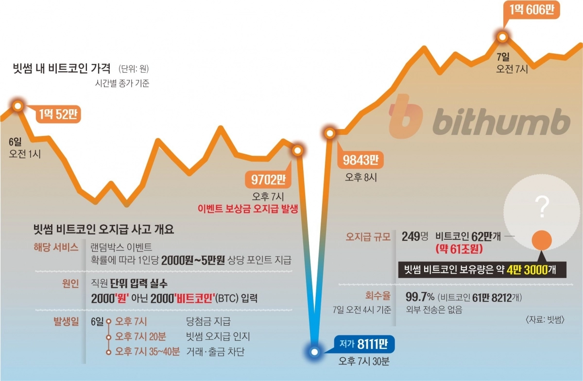 장부상 잔고만 반영하다 사달 나앞서 빗썸은 확률에 따라 2000~5만원 상당의 포인트를 지급하는 ‘랜덤박스’ 이벤트를 진행했다. 지난 6일 오후 7시쯤 이벤트 보상 지급 과정에서 직원의 실수로 ‘원’ 단위를 ‘비트코인’(BTC)으로 잘못 써 넣으며 1인당 2000원이 아닌 비트코인 2000개가 지급되는 사고가 발생했다. 이로 인해 이벤트에 참여한 이용자 695명 중 랜덤박스를 열어 본 249명에게 비트코인 62만개가 지급됐다. 전 세계 비트코인 총발행량(2100만개)의 3%에 달하는 막대한 수량으로, 당시 시세로 총 61조원 규모다. 이벤트로 지급된 비트코인 중 1788개가 갑자기 매도된 데다 패닉셀(투매)까지 겹치며 사고 당일 오후 7시 30분쯤 비트코인 가격이 같은 날 0시보다 18.5% 급락한 8111만원까지 떨어지기도 했다.