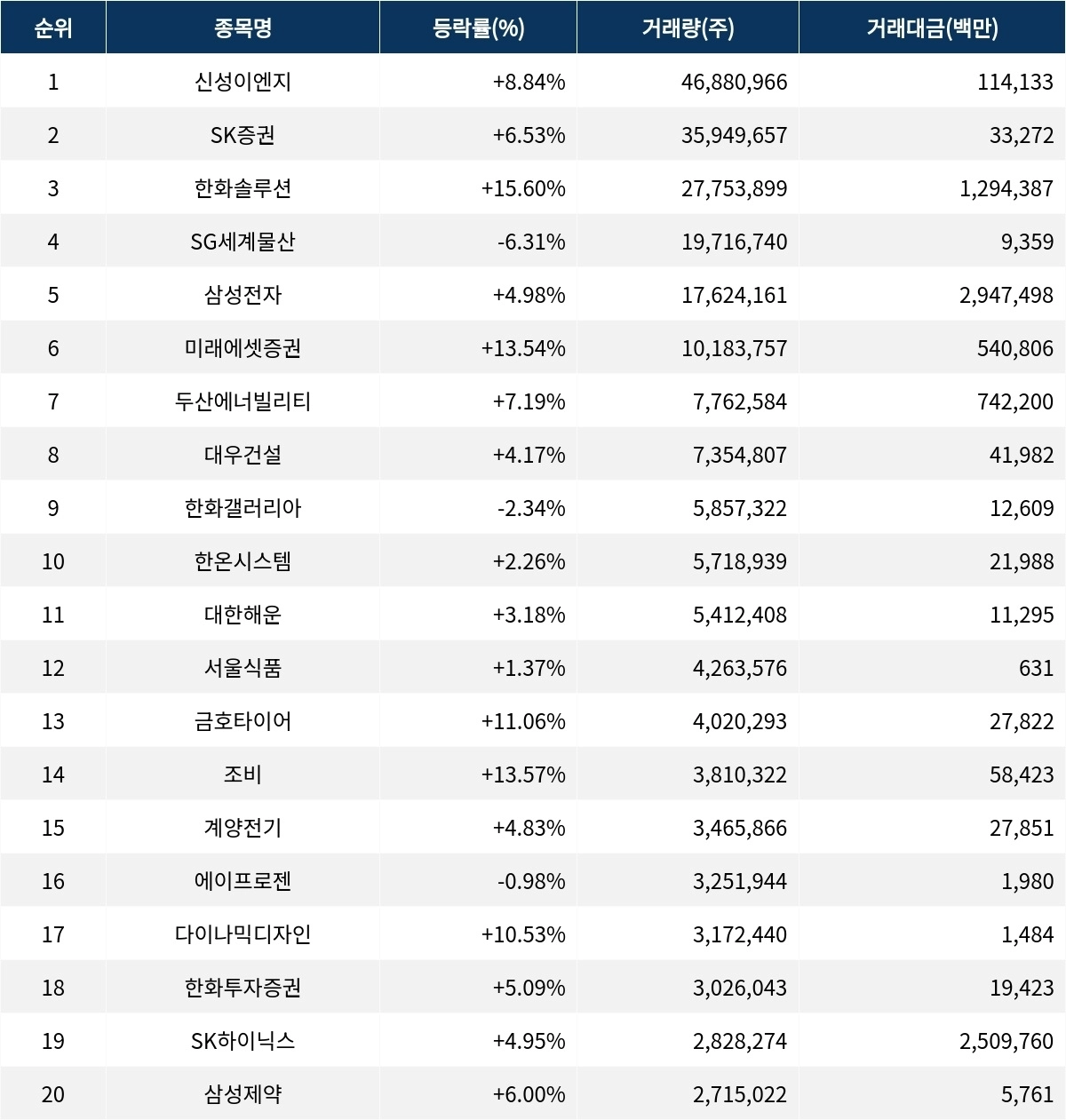한편 거래량 상위 20위권 종목들은 대한해운(005880) ▲3.18%, 서울식품(004410) ▲1.37%, 금호타이어(073240) ▲11.06%, 조비(001550) ▲13.57%, 계양전기(012200) ▲4.83%, 에이프로젠(007460) ▼0.98%, 다이나믹디자인(145210) ▲10.53%, 한화투자증권(003530) ▲5.09%, SK하이닉스(000660) ▲4.95%, 삼성제약(001360) ▲6.00% 등의 성적을 기록하고 있다.