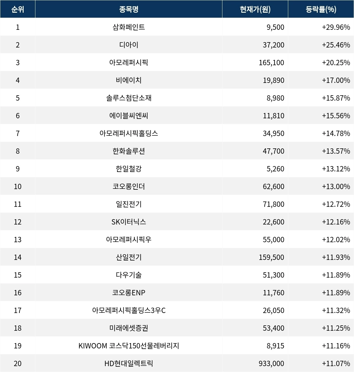 이어 상승률 2위 디아이(003160)는 주가가 25.46% 폭등하며 종가 37,200원에 상승 마감했다. 상승률 3위 아모레퍼시픽(090430)의 주가는 165,100원으로 20.25% 급등하며 강세를 보였다. 상승률 4위 비에이치(090460)는 17.00% 급등하며 19,890원에 마감했다. 상승률 5위 솔루스첨단소재(336370)는 15.87%의 상승세를 타고 8,980원에 마감했다.