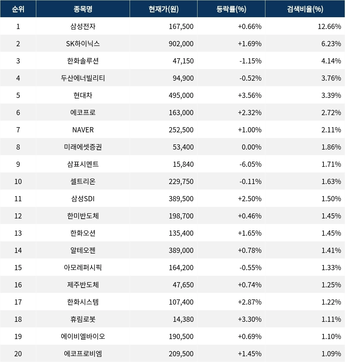 이어 SK하이닉스(000660)가 검색비율 2위를 기록하며 1.69%의 상승세를 기록하고 있다. 검색비율 3위의 한화솔루션(009830)은 1.15% 하락하며 출발했다. 검색비율 4위 두산에너빌리티(034020)는 개장 초반부터 0.52%의 하락률로 횡보 중이다. 검색비율 5위 현대차(005380)는 3.56% 상승하며 상승세를 보이고 있다.