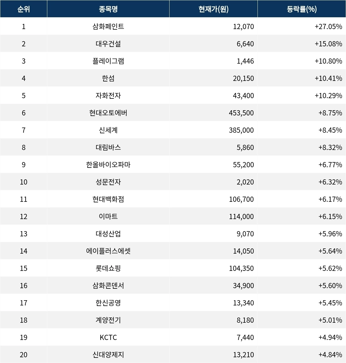 이밖에도 현대백화점(069960) ▲6.17%, 이마트(139480) ▲6.15%, 대성산업(128820) ▲5.96%, 에이플러스에셋(244920) ▲5.64%, 롯데쇼핑(023530) ▲5.62%, 삼화콘덴서(001820) ▲5.60%, 한신공영(004960) ▲5.45%, 계양전기(012200) ▲5.01%, KCTC(009070) ▲4.94%, 신대양제지(016590) ▲4.84% 등을 기록하며 시장에서 활발히 거래되고 있다.