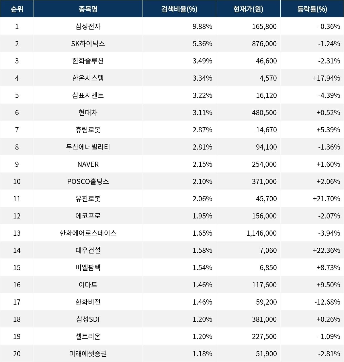 이어 검색비율 2위의 SK하이닉스(000660)는 하락률 -1.24%로 하락 마감했다. 검색비율 3위의 한화솔루션(009830)은 -2.31% 하락 마감했다. 검색비율 4위 한온시스템(018880)은 17.94%의 급등세로 마감했다. 검색비율 5위 삼표시멘트(038500)는 -4.39% 하락 마감했다.