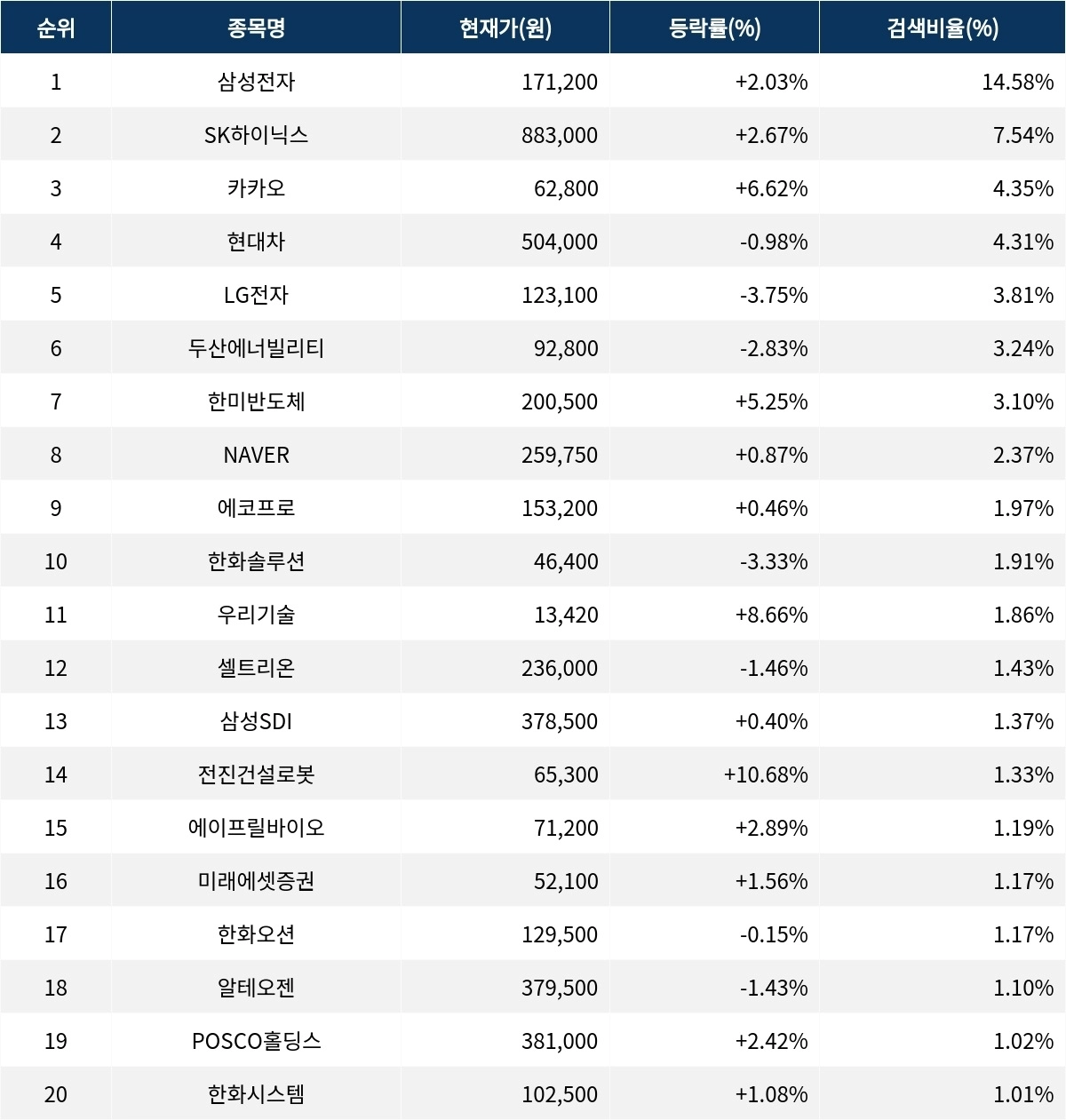 이어 SK하이닉스(000660)가 검색비율 2위를 기록하며 2.67% 상승세를 기록하고 있다. 검색비율 3위의 카카오(035720)는 6.62% 상승하며 순조롭게 출발하는 모습이다. 검색비율 4위 현대차(005380)는 개장 초반부터 -0.98%의 등락률로 보합권에 머물고 있다. 검색비율 5위 LG전자(066570)는 -3.75% 하락하며 주가가 다소 내리고 있다.