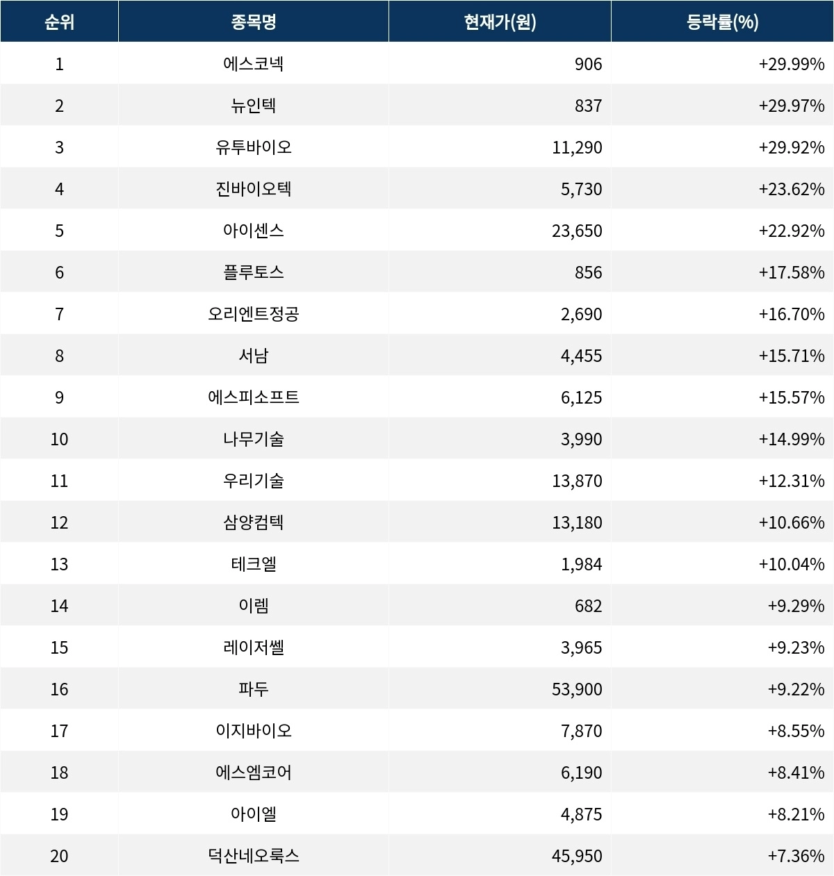이어 상승률 2위 뉴인텍(012340)은 현재가 837원으로 주가가 29.97% 폭등하고 있다. 상승률 3위 유투바이오(221800)는 현재 1만 1290원으로 29.92% 폭등하며 강세를 보이고 있다. 상승률 4위 진바이오텍(086060)은 23.62% 폭등하며 5730원에 거래되고 있다. 상승률 5위 아이센스(099190)는 22.92%의 상승세를 타고 2만 3650원에 거래되고 있다.