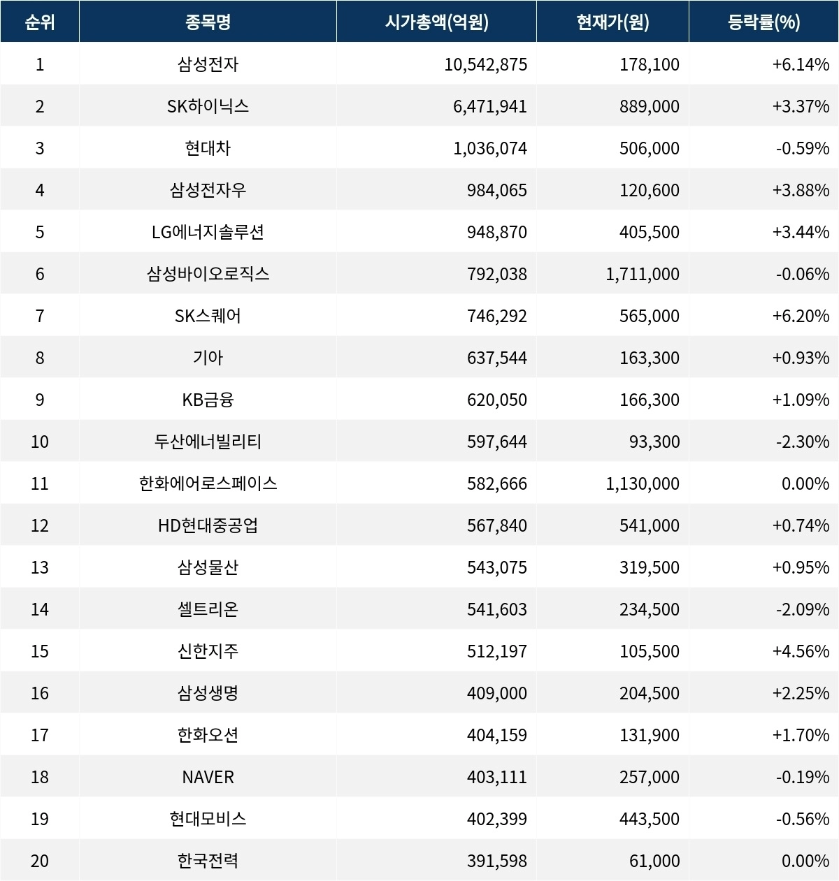 한편 시가총액 20위권 종목들은 한화에어로스페이스(012450) 0.00%, HD현대중공업(329180) ▲0.74%, 삼성물산(028260) ▲0.95%, 셀트리온(068270) ▼2.09%, 신한지주(055550) ▲4.56%, 삼성생명(032830) ▲2.25%, 한화오션(042660) ▲1.70%, NAVER(035420) ▼0.19%, 현대모비스(012330) ▼0.56%, 한국전력(015760) 0.00% 등의 성적을 기록하고 있다.