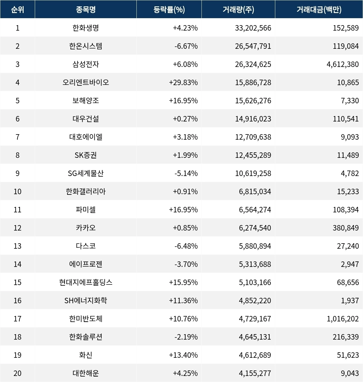 한편, 거래량 상위 20위권 종목들은 파미셀(005690) ▲16.95%, 카카오(035720) ▲0.85%, 다스코(058730) ▼6.48%, 에이프로젠(007460) ▼3.70%, 현대지에프홀딩스(005440) ▲15.95%, SH에너지화학(002360) ▲11.36%, 한미반도체(042700) ▲10.76%, 한화솔루션(009830) ▼2.19%, 화신(010690) ▲13.40%, 대한해운(005880) ▲4.25% 등의 성적을 기록했다.