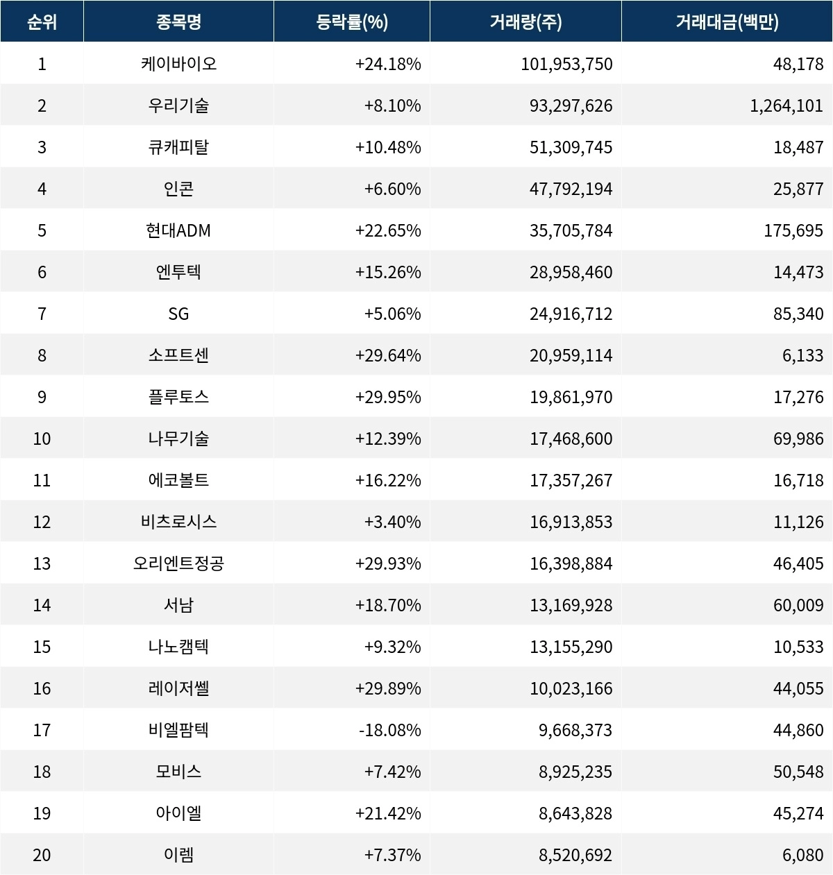 한편 거래량 상위 20위권 종목들은 에코볼트(097780) ▲16.22%, 비츠로시스(054220) ▲3.40%, 오리엔트정공(065500) ▲29.93%, 서남(294630) ▲18.70%, 나노캠텍(091970) ▲9.32%, 레이저쎌(412350) ▲29.89%, 비엘팜텍(065170) ▼18.08%, 모비스(250060) ▲7.42%, 아이엘(307180) ▲21.42%, 이렘(009730) ▲7.37% 등의 성적을 기록했다.