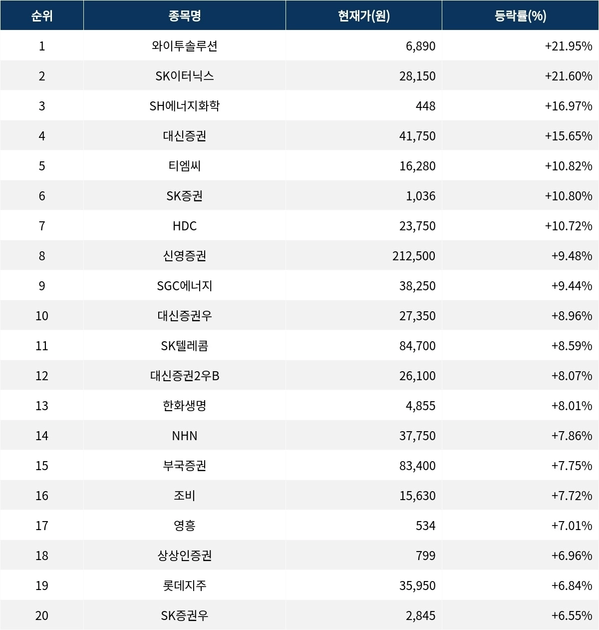 6위 SK증권(001510)은 현재가 1036원으로 10.80% 상승 중이다. 7위 HDC(012630)는 현재가 2만 3750원으로 10.72% 상승 중이다. 8위 신영증권(001720)은 현재가 21만 2500원으로 9.48% 상승 중이다. 9위 SGC에너지(005090)는 현재가 3만 8250원으로 9.44% 상승 중이다. 10위 대신증권우(003545)는 현재가 2만 7350원으로 8.96% 상승 중이다.