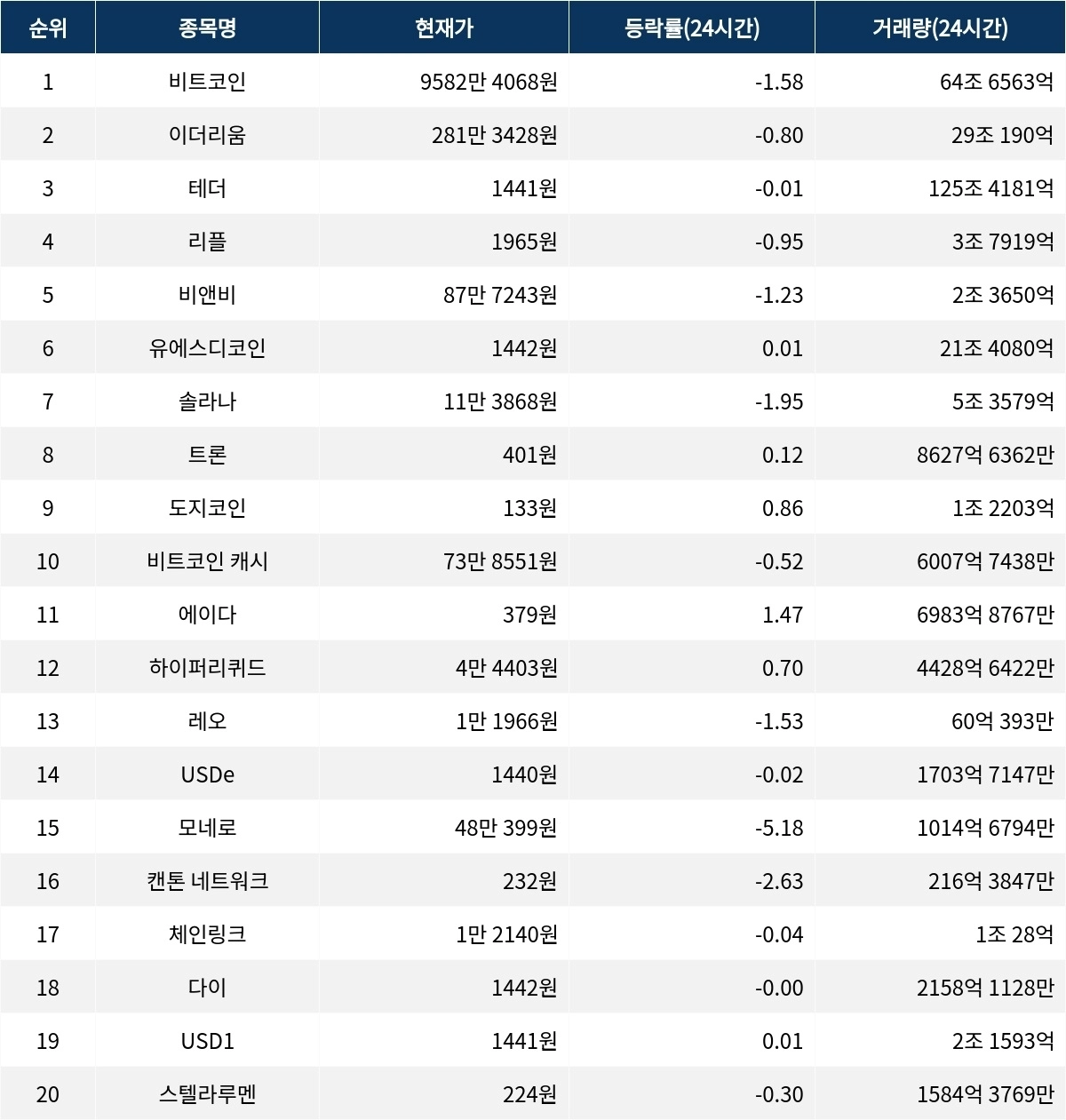 글로벌 가상자산 시황 중계 사이트 코인마켓캡(CoinMarketCap)에 따르면, 현재 시가총액 상위 종목 중 비트코인은 9,582만 4,068원에 거래되고 있으며 시가총액은 1,915조 3,772억 원이다. 24시간 동안 비트코인은 1.58% 하락했고, 1시간 등락률은 -0.35%로 단기적으로 하락세가 지속될 가능성이 있다. 거래량은 64조 6,563억 원으로 집계되었다.