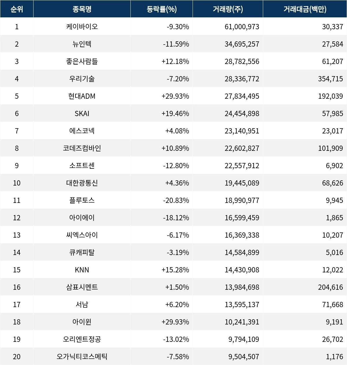 한편, 거래량 상위 20위권 종목들은 플루토스(019570) ▼20.83%, 아이에이(038880) ▼18.12%, 씨엑스아이(900120) ▼6.17%, 큐캐피탈(016600) ▼3.19%, KNN(058400) ▲15.28%, 삼표시멘트(038500) ▲1.50%, 서남(294630) ▲6.20%, 아이윈(090150) ▲29.93%, 오리엔트정공(065500) ▼13.02%, 오가닉티코스메틱(900300) ▼7.58% 등의 성적을 기록했다.