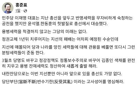 홍 전 시장은 “내란 잔당을 그대로 두면 다가오는 지선뿐만 아니라 향후 총선에서도 가망이 없다”면서 마땅히 결단해야 할 때 결단하지 못하면 혼란을 빚게 된다는 뜻의 ‘당단부단(當斷不斷) 반수기란(反受其亂)’을 명심하라고 언급했다.