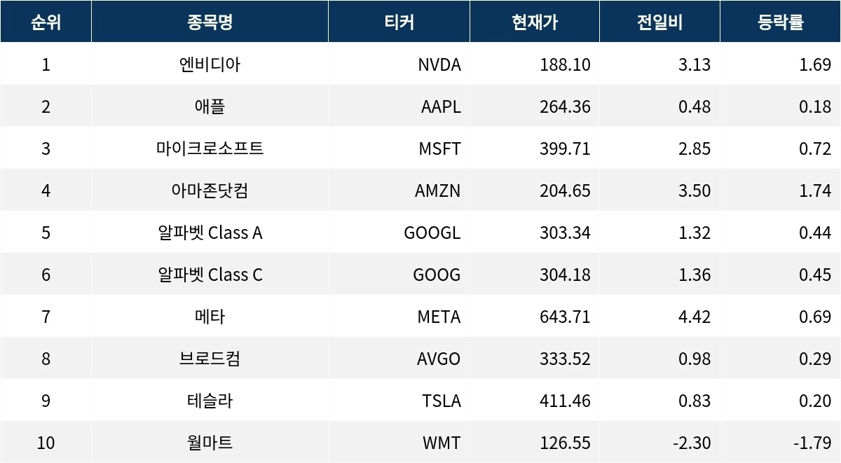 엔비디아는 전일 대비 1.69% 상승하여 188.10달러에 거래되고 있다. 애플은 0.18% 오르며 264.36달러를 기록하고 있다. 마이크로소프트는 0.72% 상승하여 399.71달러에 거래 중이다.