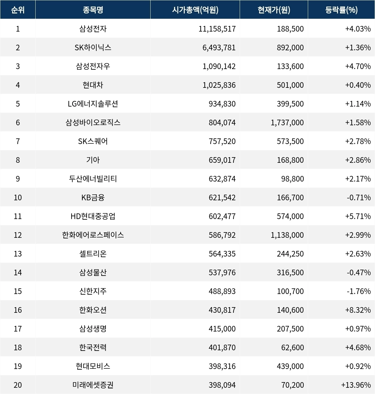 한편 시가총액 20위권 종목들은 HD현대중공업(329180) ▲5.71%, 한화에어로스페이스(012450) ▲2.99%, 셀트리온(068270) ▲2.63%, 삼성물산(028260) ▼0.47%, 신한지주(055550) ▼1.76%, 한화오션(042660) ▲8.32%, 삼성생명(032830) ▲0.97%, 한국전력(015760) ▲4.68%, 현대모비스(012330) ▲0.92%, 미래에셋증권(006800) ▲13.96% 등의 성적을 기록하고 있다.