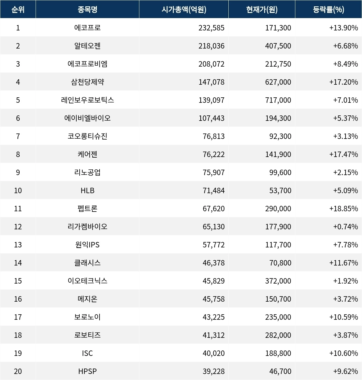 19일 한국거래소에 따르면, 시가총액 1위 에코프로(086520)는 현재가 171,300원으로 전 거래일 대비 13.90% 오르며 급등하고 있다. 시가총액은 23조 2,585억원으로, 외국인비율은 20.63%다. 거래량은 4,405,403주로 집계되고 있다. 시가총액 2위 알테오젠(196170)은 407,500원으로 6.68% 상승하며 강세를 보이고 있으며, 시가총액은 21조 8,036억원, 외국인비율은 13.26%다. 거래량은 494,052주로 나타나고 있다.
