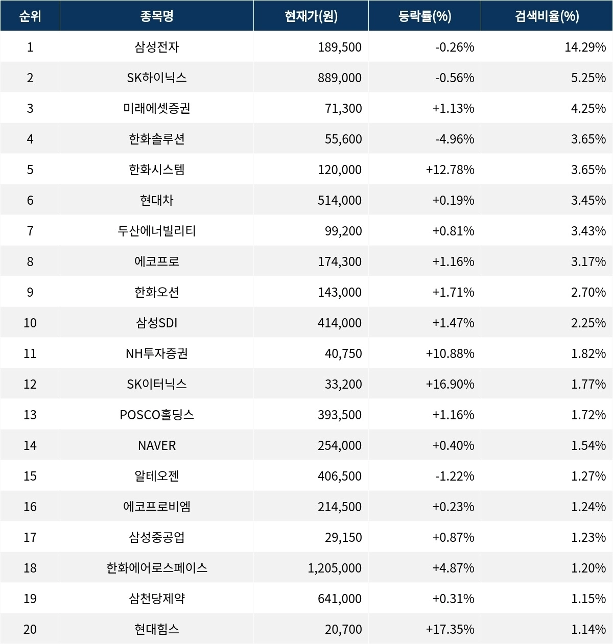 이어 SK하이닉스(000660)가 검색비율 2위를 기록하며 0.56%의 하락세를 기록하고 있다. 검색비율 3위의 미래에셋증권(006800)은 1.13% 상승하며 순조롭게 출발하는 모습이다. 검색비율 4위 한화솔루션(009830)은 개장 초반부터 4.96%의 하락률로 주가가 하락 중이다. 검색비율 5위 한화시스템(272210)은 12.78%의 급등세를 보이고 있다.