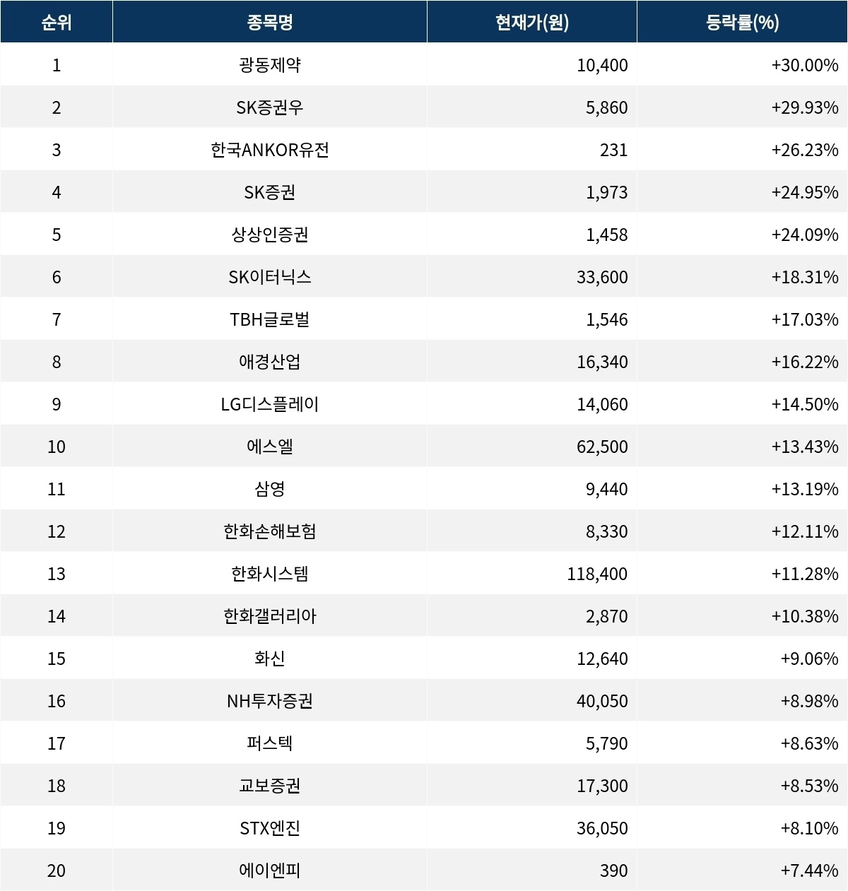6위 SK이터닉스(475150)는 현재가 3만 3600원으로 18.31% 급등 중이다. 7위 TBH글로벌(084870)은 현재가 1546원으로 17.03% 급등 중이다. 8위 애경산업(018250)은 현재가 1만 6340원으로 16.22% 급등 중이다. 9위 LG디스플레이(034220)는 현재가 1만 4060원으로 14.50% 급등 중이다. 10위 에스엘(005850)은 현재가 6만 2500원으로 13.43% 급등 중이다.
