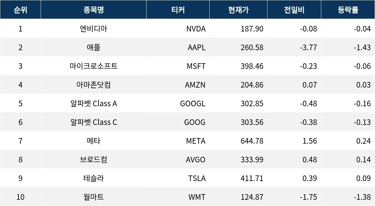애플(AAPL)은 1.43% 하락하며 260.58달러에 거래를 마쳤다. 마이크로소프트(MSFT)는 0.06% 하락해 398.46달러에 거래를 종료했다. 메타(META)는 0.24% 상승하며 644.78달러로 마감했다.