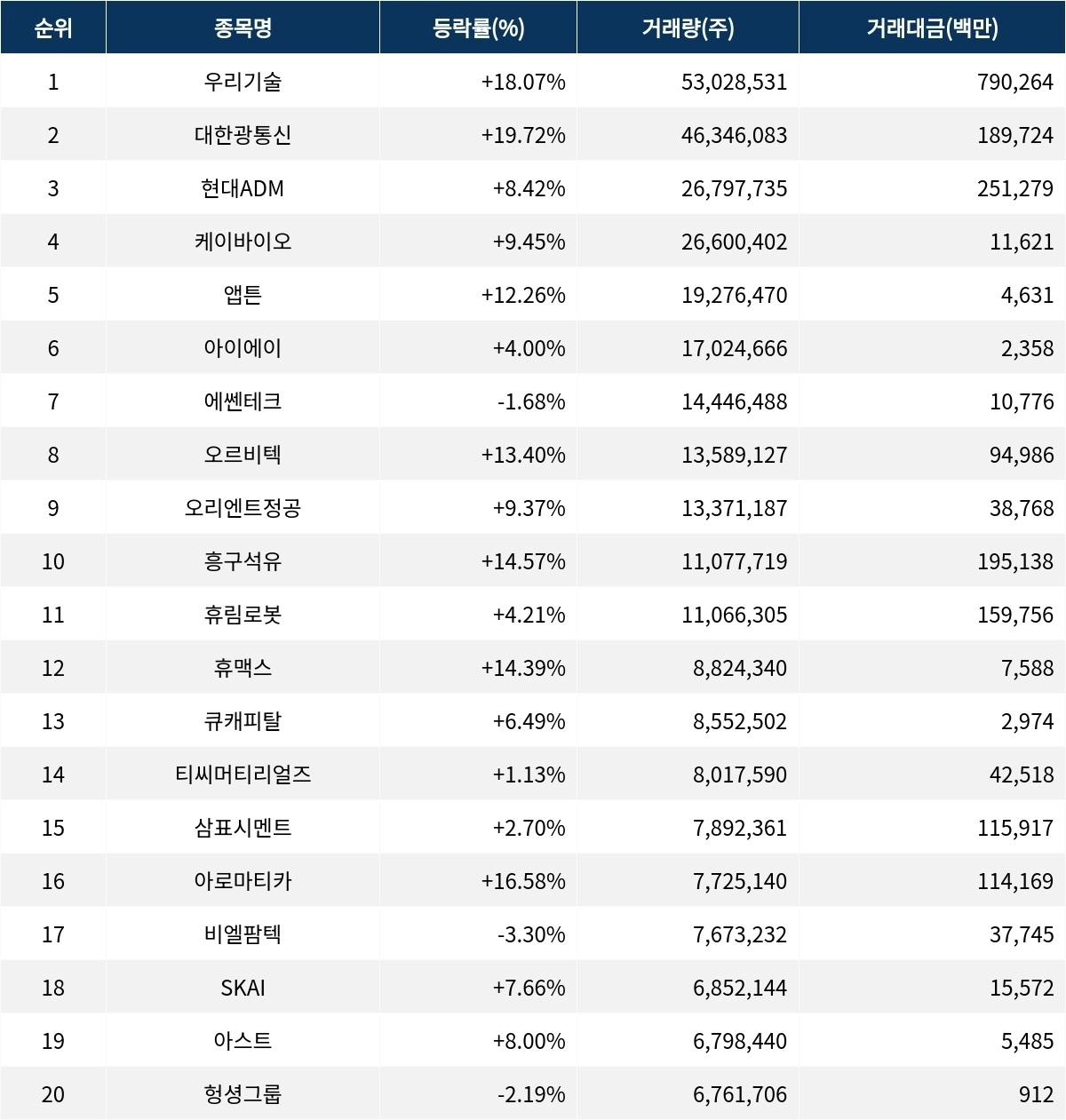 한편 거래량 상위 20위권 종목들은 휴림로봇(090710) ▲4.21%, 휴맥스(115160) ▲14.39%, 큐캐피탈(016600) ▲6.49%, 티씨머티리얼즈(125020) ▲1.13%, 삼표시멘트(038500) ▲2.70%, 아로마티카(0015N0) ▲16.58%, 비엘팜텍(065170) ▼3.30%, SKAI(357880) ▲7.66%, 아스트(067390) ▲8.00%, 헝셩그룹(900270) ▼2.19% 등의 성적을 기록하고 있다.