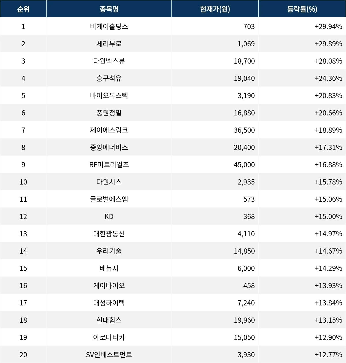 [서울데이터랩]비케이홀딩스 29.94% 상한가 금일 증시 상승률 1위로 마감