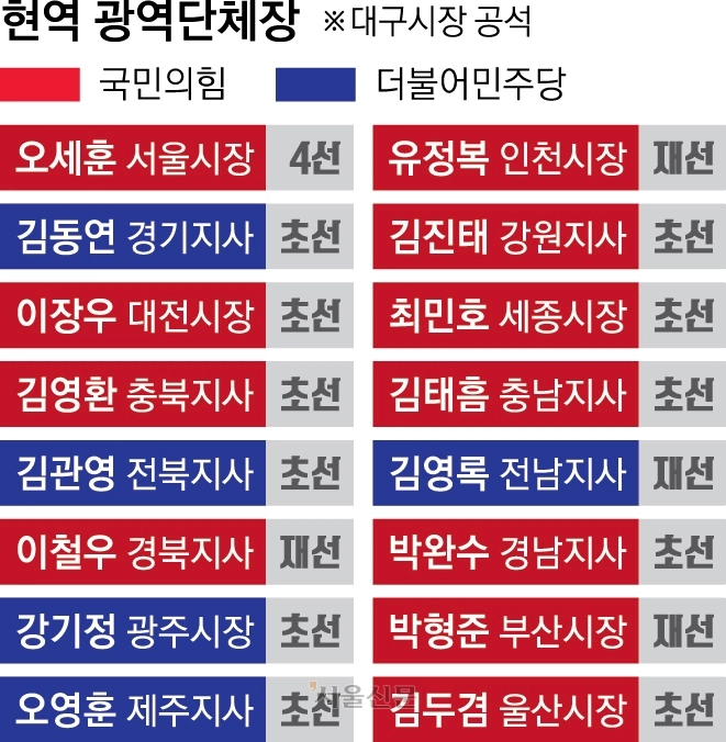 6·3 지방선거가 100일 앞으로 다가온 가운데 여야 모두 현역 광역단체장들이 ‘프리미엄’을 누리기 힘든 구도가 되면서 이번 선거로 ‘대규모 판갈이’가 이뤄질 수 있다는 전망이 나온다. 여당은 ‘명심’(이재명 대통령 의중), 야당은 ‘후보 교체론’으로 현역 단체장의 입지가 줄어드는 모양새다. 행정통합이 가시화되며 단체장 숫자가 줄어들면 당내 경쟁도 더 치열해질 것으로 예상된다.