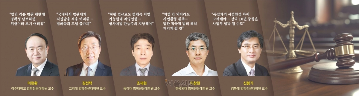 신봉기 경북대 법학전문대학원 교수는 “독일의 경우 실제 이를 적용하는 사례는 거의 없고 강력한 처벌보다는 상징성이 강한 제도로 기능하고 있다”면서 “국내에서 뒤늦게 법왜곡죄를 신설하며 징역 10년 이하의 중형으로 처벌하도록 한다는 것은 법관에 대한 압박의 의도로 느껴질 수 있다”고 밝혔다.