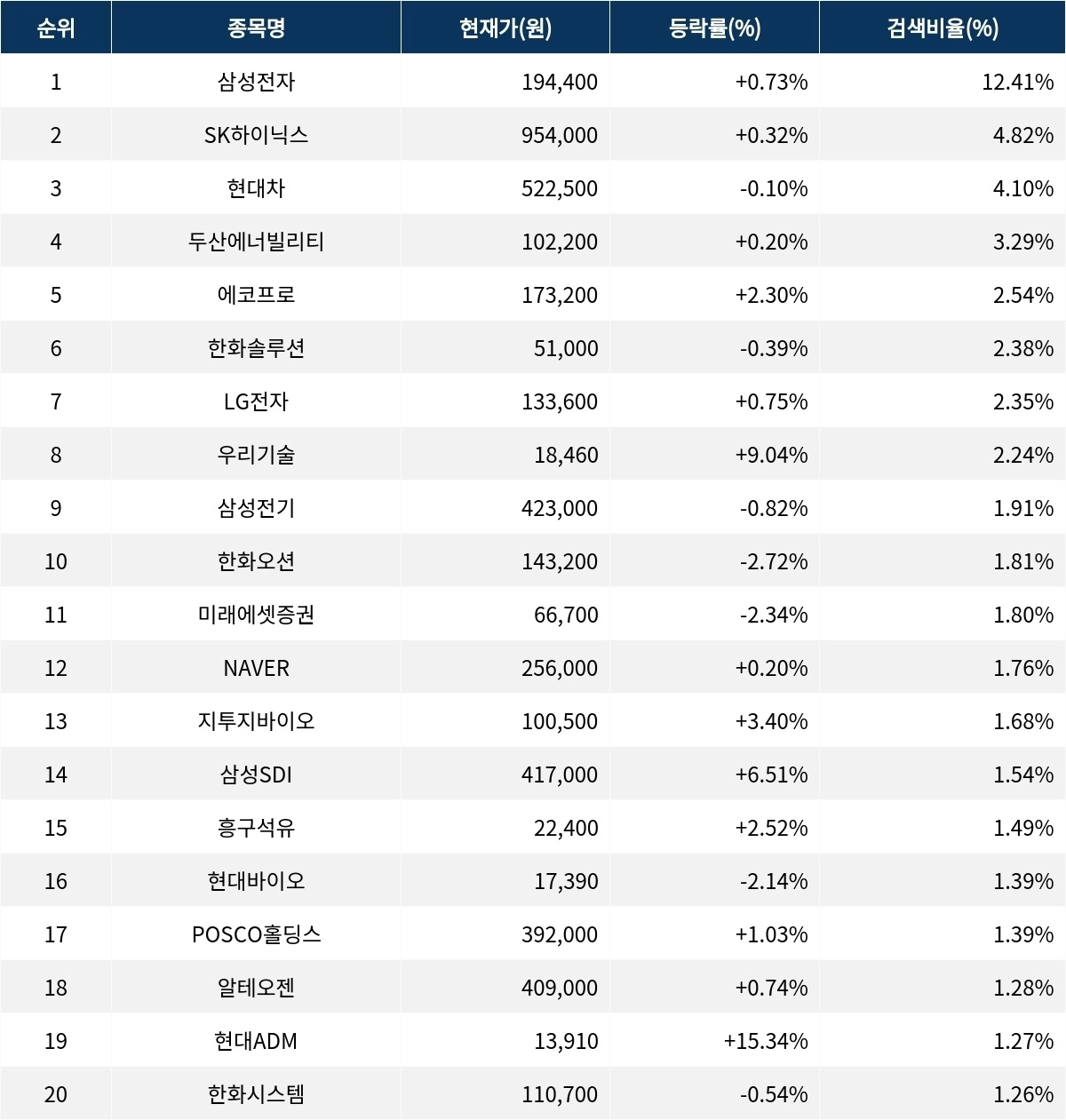 이어 SK하이닉스(000660)가 검색 비율 2위를 기록하며 0.32%의 상승세를 보이고 있다. 검색 비율 3위의 현대차(005380)는 0.10% 하락하며 큰 변동 없이 출발하는 모습이다. 검색 비율 4위 두산에너빌리티(034020)는 개장 초반부터 0.20% 상승세를 보이고 있다. 검색 비율 5위 에코프로(086520)는 2.30% 상승하며 활기를 띠고 있다.