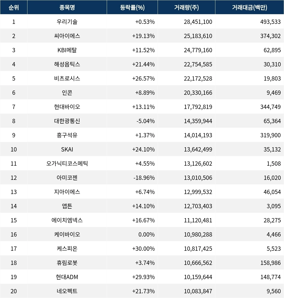 KBI메탈(024840)은 2477만 9160주가 거래되며 11.5% 상승해 주가 2565원을 기록하고 있다. 해성옵틱스(076610)는 1348원으로 폭등하며 거래량 2275만 4585주를 기록했다. 비츠로시스(054220)도 큰 폭의 상승세를 보이며 26.6% 상승해 주가 905원을 기록하고 있다. 인콘(083640)은 2033만 166주가 거래되며 8.9% 상승했다. 현대바이오(048410)는 13.1% 상승한 2만 100원으로, 거래량 1779만 2819주를 기록 중이다. 대한광통신(010170)은 5.0% 하락하며 4510원을 기록했고, 흥구석유(024060)는 1.4% 상승하며 2만 2150원에 거래되고 있다. SKAI(357880)도 24.1% 상승하며 2755원으로 거래 중이다.