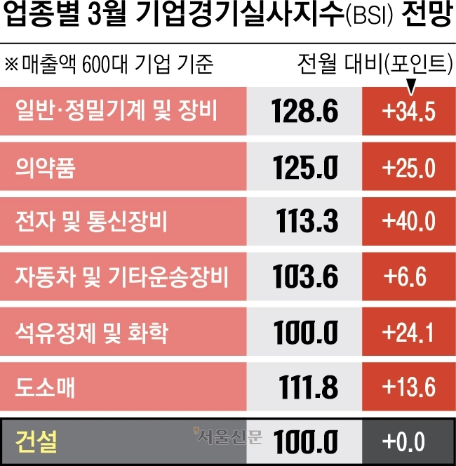 하지만 비제조업 가운데 건설업은 100.0으로 전월과 같았다. 부문별로 보면 투자 부문 BSI에서 건설은 83.3에 그쳐, 건설 경기 위축이 장기화할 수 있다는 우려가 나온다.