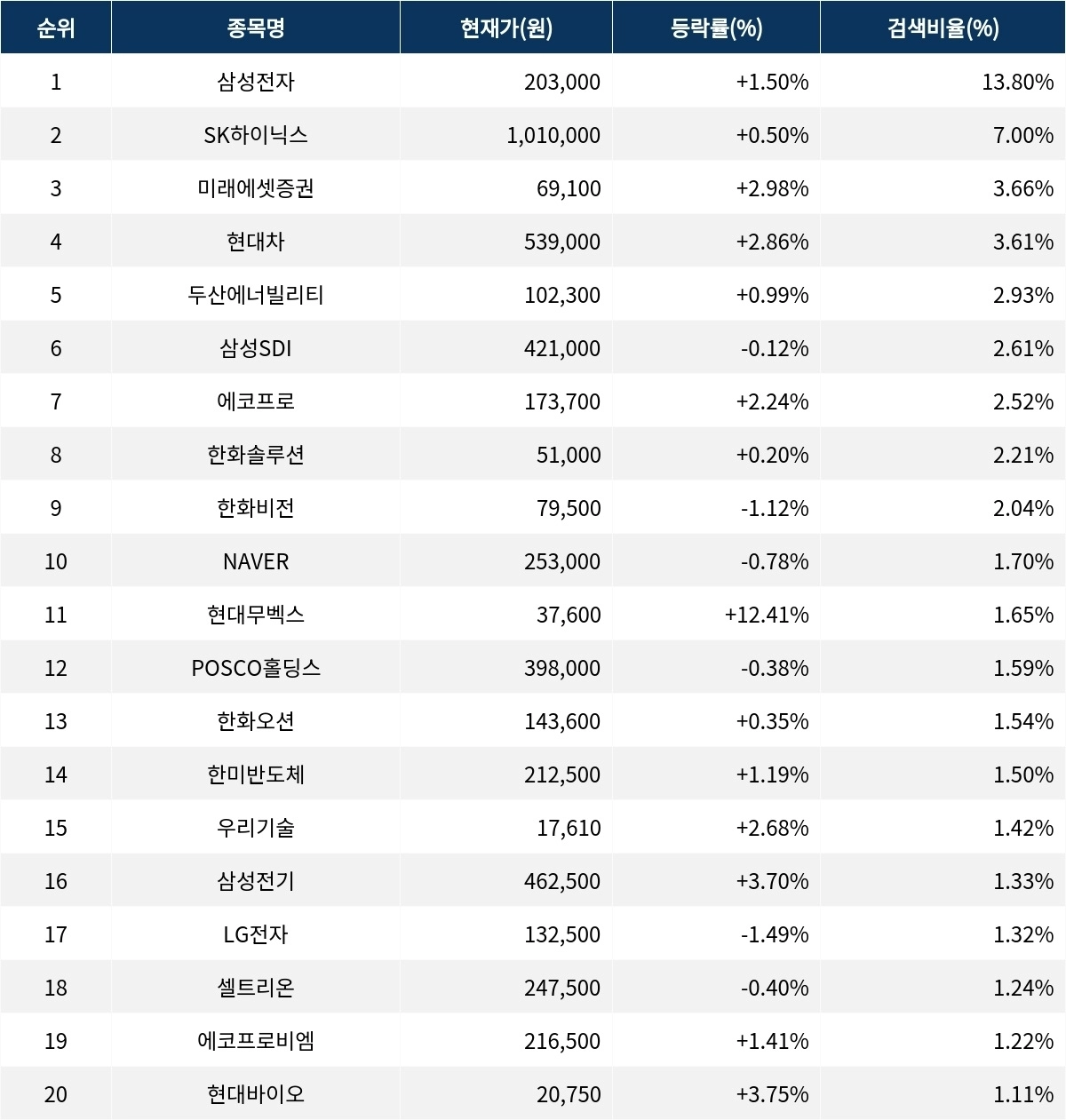 이어 SK하이닉스(000660)가 검색 비율 2위를 기록하며 0.5%의 상승세를 보이고 있다. 검색 비율 3위의 미래에셋증권(006800)은 2.98% 상승하며 순조롭게 출발하는 모습이다. 4위 현대차(005380)는 개장 초반부터 2.86%의 상승률을 보이고 있다. 5위 두산에너빌리티(034020)는 0.99% 상승하며 큰 움직임을 보이지 않고 있다.