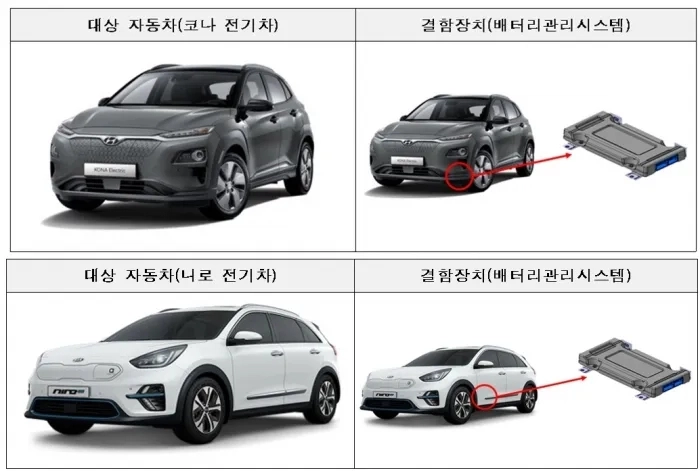 기아의 니로 전기차(니로 EV) 1590대도 같은 문제가 발견돼 함께 시정조치를 한다. 리콜 시작일은 현대차와 동일하다.