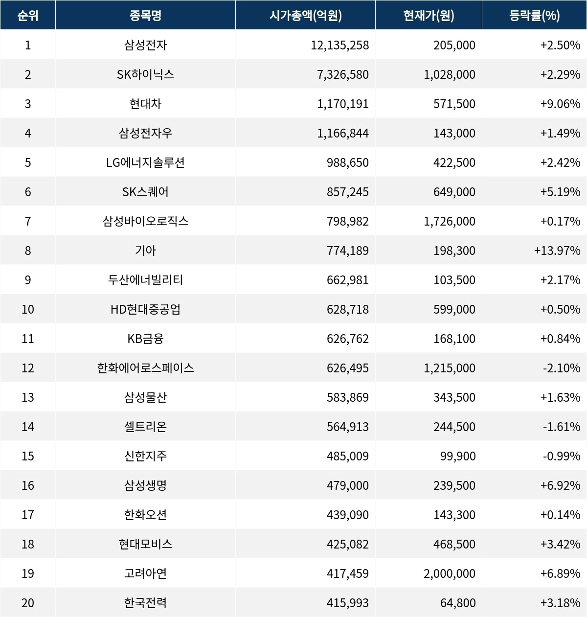 25일 오후 12시 30분 한국거래소에 따르면 시가총액 1위 삼성전자는 현재가 20만 5000원으로 전 거래일 대비 2.50% 상승하며 시가총액 1223조 5258억원을 기록하고 있다. 삼성전자의 외국인 비율은 50.96%이며 거래량은 1558만 7391주다. SK하이닉스는 102만 8000원으로 2.29% 상승하며 시가총액 748조 2658억원을 보이고 있다. 외국인 비율은 54.64%이며 거래량은 192만 5614주다.