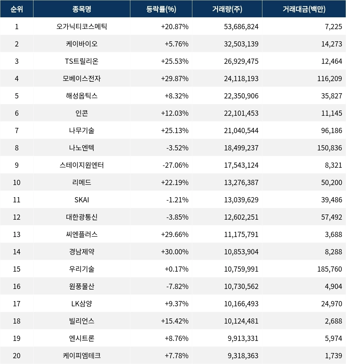 TS트릴리온(317240)은 2692만 4756주가 거래되며 거래량 상위권을 차지했다. 현재 주가는 485원으로 등락률은 28.98%를 기록하며 강한 상승세를 보이고 있다. 모베이스전자(012860)는 5000원으로 거래되며 29.87% 상승했다. 나노엔텍(039860)은 8340원으로 8.74% 상승세를 기록하고 있다. 스테이지원엔터(078860)는 29.90%로 급락하며 현재 주가는 654원이다. 리메드(302550)는 3695원으로 15.46% 상승세를 보이고 있다.