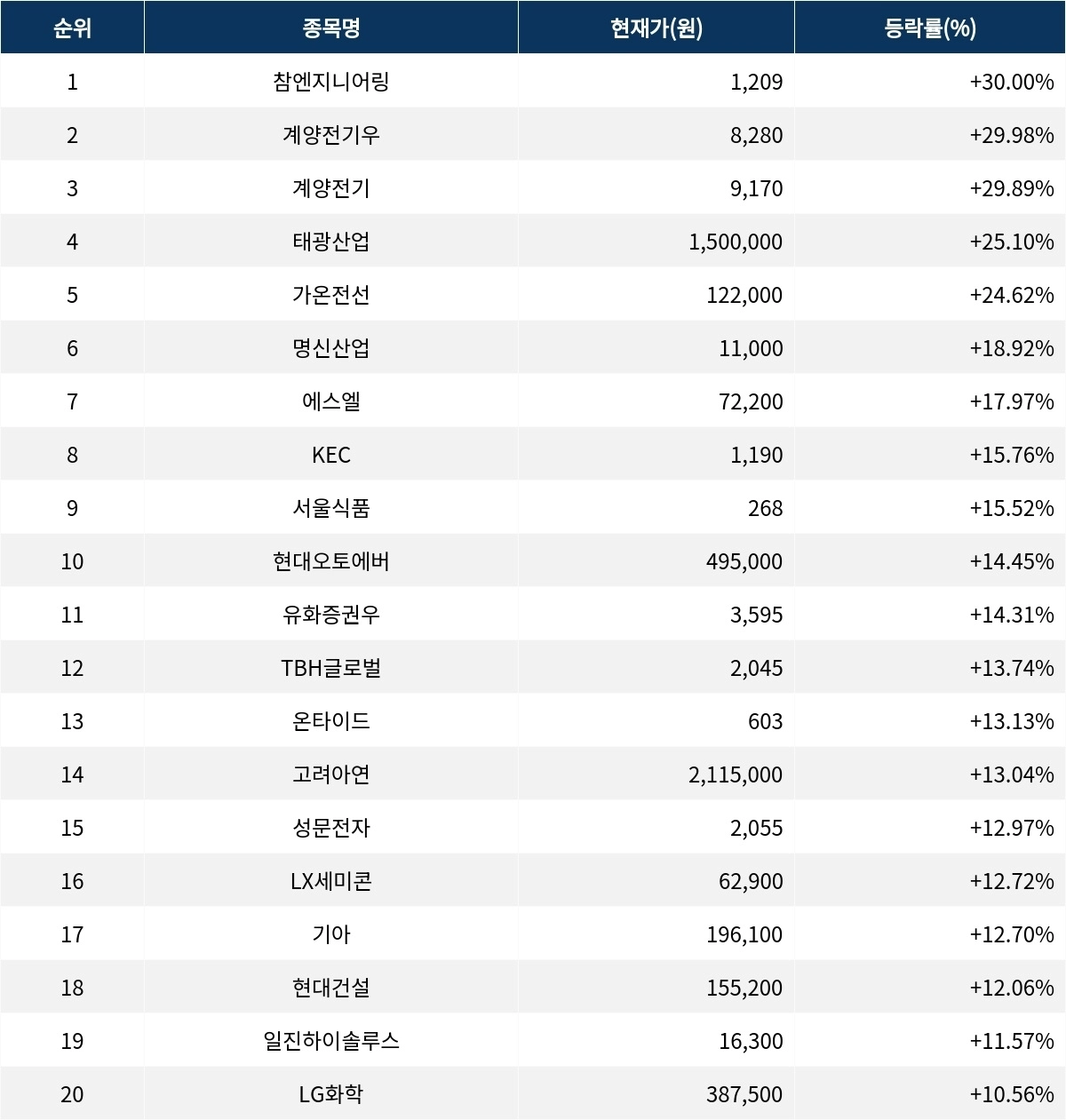 이어 상승률 2위 계양전기우(012205)는 주가가 29.9% 폭등하며 종가 8280원에 상승 마감했다. 상승률 3위 계양전기(012200)의 주가는 9170원으로 29.8% 폭등하며 마감했다. 상승률 4위 태광산업(003240)은 25.1% 상승하며 150만원에 마감했다. 상승률 5위 가온전선(000500)은 24.6%의 상승세를 타고 12만 2000원에 마감했다.