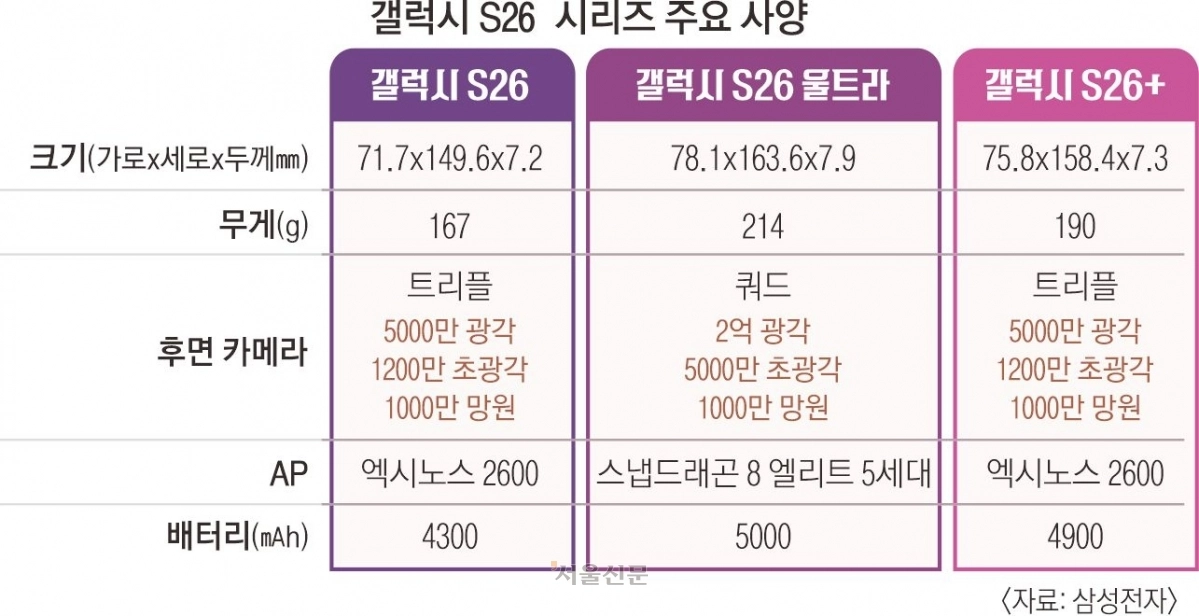 삼성전자는 25일(현지시간) 미국 샌프란시스코에서 ‘갤럭시 언팩 2026’ 행사를 개최하고 강력한 AI를 결합한 3세대 휴대전화 ‘갤럭시 S26 시리즈’를 공개했다. ‘갤럭시 S26 울트라’, ‘갤럭시 S26+’, ‘갤럭시 S26’ 총 3개의 모델로 구성된 S26 시리즈는 갤럭시 AI를 대폭 업그레이드해 누구나 일상 속에서 쉽고 빠르게 활용할 수 있도록 강화한 것이 특징이다.