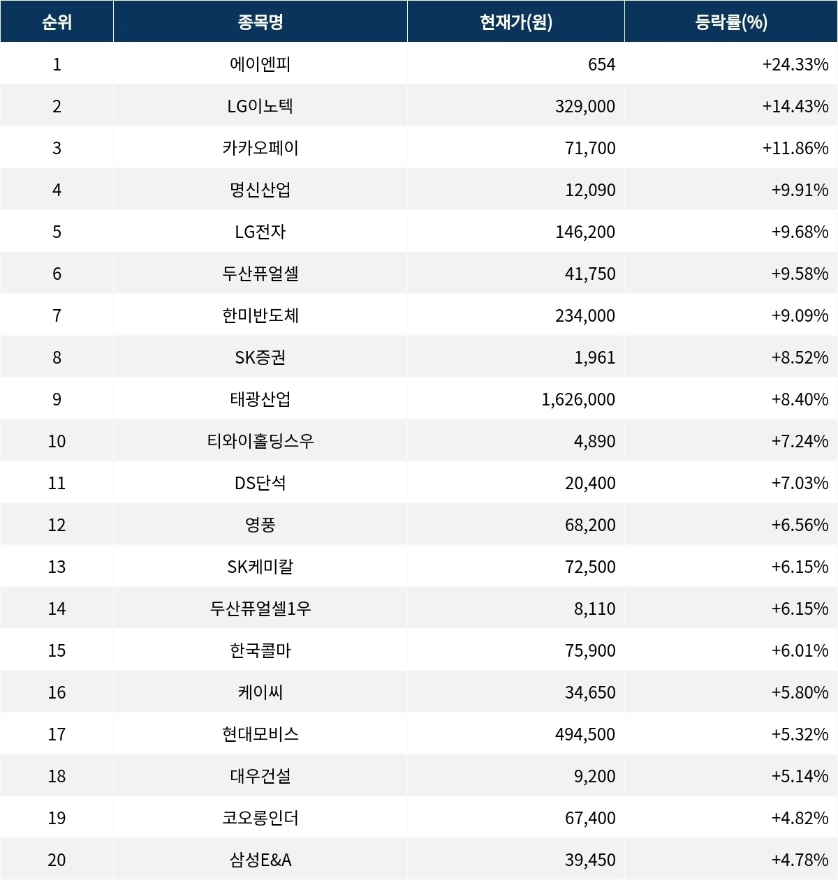 6위 두산퓨얼셀(336260)은 현재가 4만 1750원으로 9.6% 상승 중이다. 7위 한미반도체(042700)는 현재가 23만 4000원으로 9.1% 상승 중이다. 8위 SK증권(001510)은 현재가 1961원으로 8.5% 상승 중이다. 9위 태광산업(003240)은 현재가 162만 6000원으로 8.4% 상승 중이다. 10위 티와이홀딩스우(36328K)는 현재가 4890원으로 7.2% 상승 중이다.