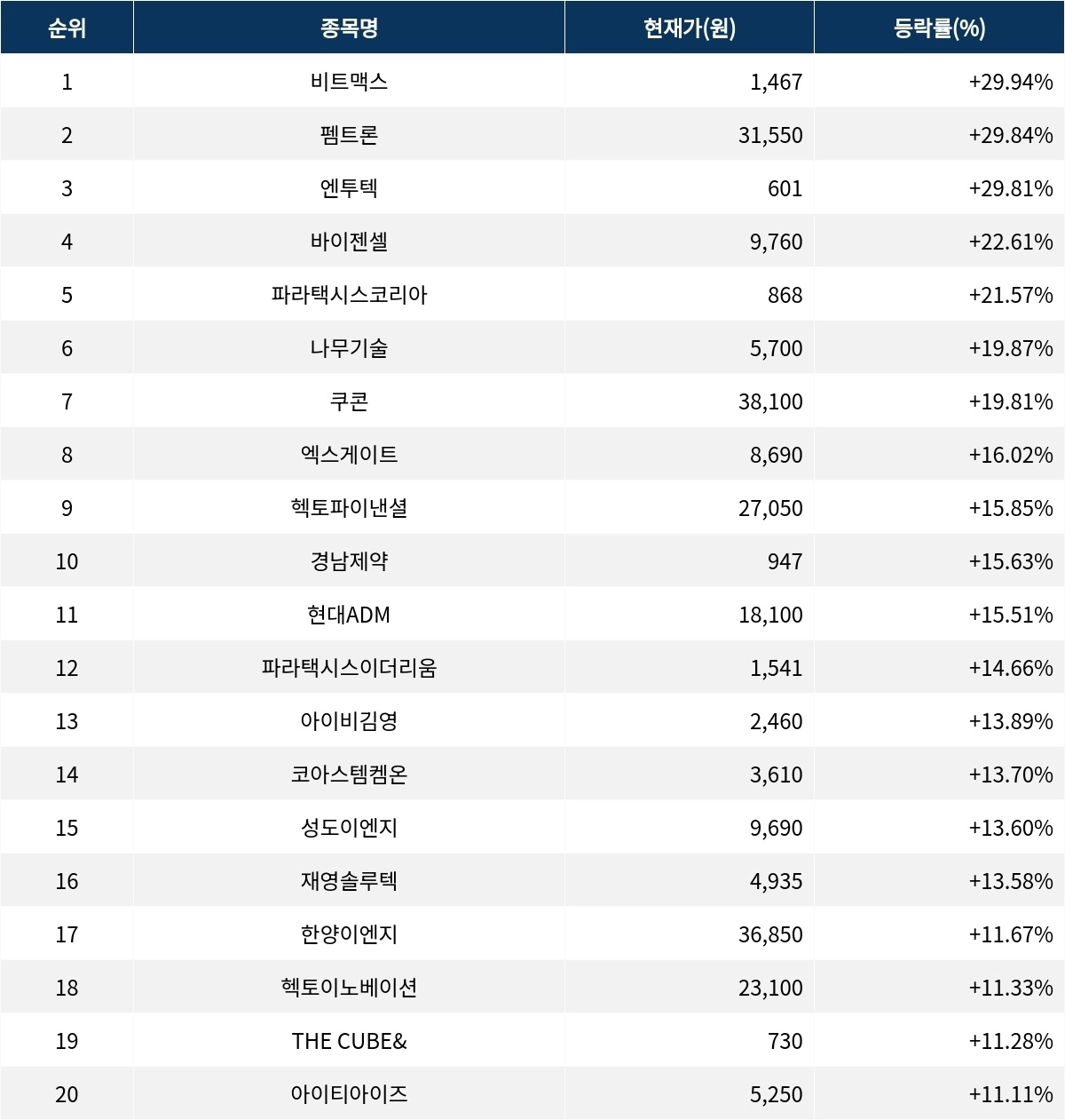 6위 나무기술(242040)은 현재가 5700원으로 19.87% 상승 중이다. 7위 쿠콘(294570)은 현재가 3만 8100원으로 19.81% 상승 중이다. 8위 엑스게이트(356680)는 현재가 8690원으로 16.02% 상승 중이다. 9위 헥토파이낸셜(234340)은 현재가 2만 7050원으로 15.85% 상승 중이다. 10위 경남제약(053950)은 현재가 947원으로 15.63% 상승 중이다.