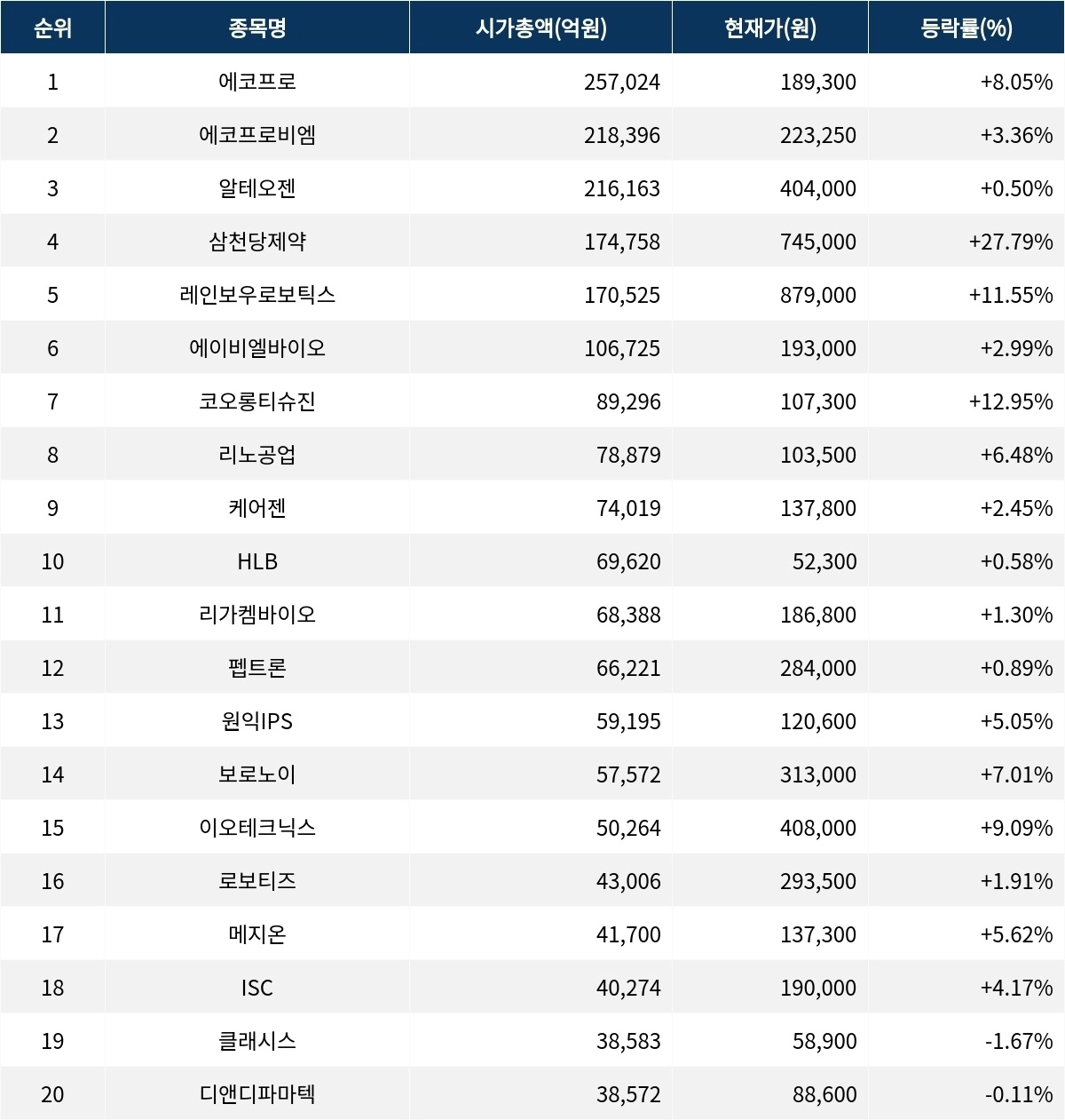 한편 시가총액 20위권 종목들은 리가켐바이오(1.30% 상승), 펩트론(0.89% 상승), 보로노이(7.01% 상승), 이오테크닉스(9.09% 상승), 디앤디파마텍(0.11% 하락) 등의 성적을 기록하고 있다.