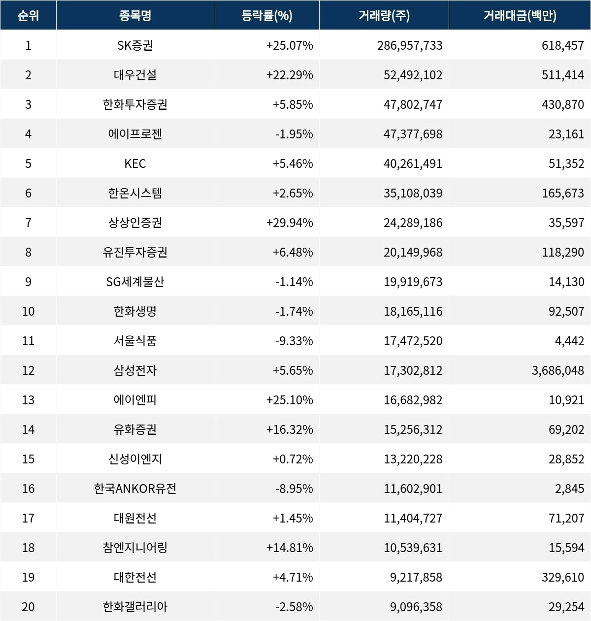 한화투자증권(003530)은 47,802,747주의 거래량과 현재가 8,680원으로 +5.85%의 상승세를 기록하고 있다. 에이프로젠(007460)은 47,377,698주의 거래량과 -1.95%의 하락세를 보이며, KEC(092220)는 40,261,491주의 거래량과 +5.46%의 상승률을 보이고 있다. 한온시스템(018880)은 35,108,039주의 거래량과 +2.65%의 상승률을 기록한다. 상상인증권(001290)은 +29.94%의 상한가로 마감하며 24,289,186주의 거래량을 기록했다. 유진투자증권(001200), SG세계물산(004060), 한화생명(088350)은 각각 20,149,968주, 19,919,673주, 18,165,116주의 거래량을 기록하며, 각각 +6.48%, -1.14%, -1.74%의 등락률을 보인다.