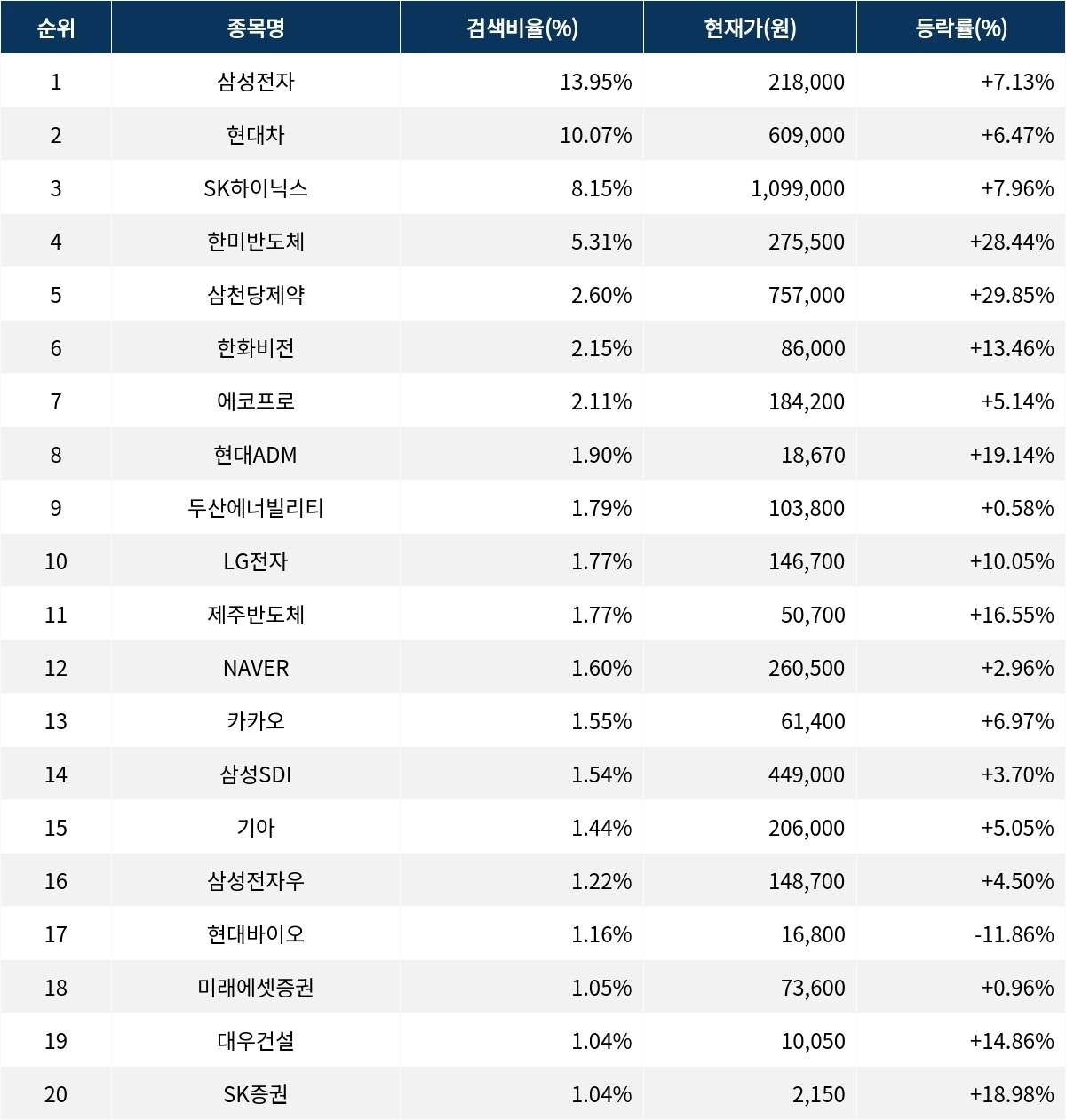 이어 검색비율 2위의 현대차(005380)는 상승률 6.47%로 상승 마감했다. 검색비율 3위의 SK하이닉스(000660)는 7.96% 상승 마감했다. 검색비율 4위 한미반도체(042700)는 28.44%의 급등세로 마감했다. 검색비율 5위 삼천당제약(000250)은 29.85% 상승하며 상한가로 마감했다.