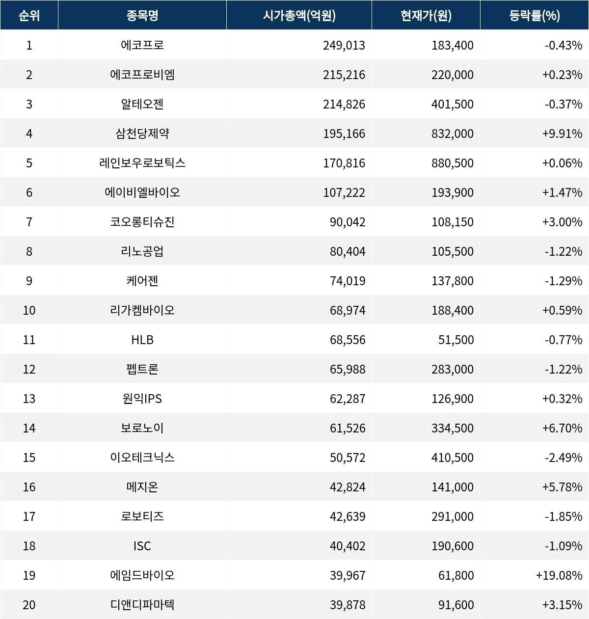알테오젠(196170) ▼0.37%, 삼천당제약(000250) +9.91%, 레인보우로보틱스(277810) +0.06%, 에이비엘바이오(298380) +1.47%, 코오롱티슈진(950160) +3.00%, 리노공업(058470) ▼1.22%, 케어젠(214370) ▼1.29%, 리가켐바이오(141080) +0.59%