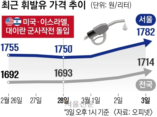 서울 성북구 길음동에 사는 이항주(74)씨는 3일 오전 자택에서 3㎞ 넘게 떨어진 동대문구 A 주유소를 찾았다. 인근 주유소 다섯 곳을 지나쳐 상대적으로 저렴한 곳을 골랐다. 이씨는 “중동전쟁은 이제 시작인데 앞으로 기름값이 얼마나 더 오를지 걱정”이라며 혀를 찼다. 이씨는 돋보기안경을 밀어 올린 채 휘발유 약 14ℓ를 넣고 받은 2만 5000원짜리 영수증을 한동안 들여다봤다.