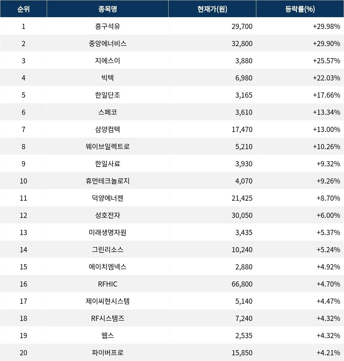 이어 상승률 2위 중앙에너비스(000440)는 현재가 3만 2800원으로 주가가 29.90% 폭등하고 있다.상승률 3위 지에스이(053050)는 현재 3880원으로 25.57% 폭등하며 주목받고 있다.상승률 4위 빅텍(065450)은 22.03% 폭등하며 6980원에 거래되고 있다.상승률 5위 한일단조(024740)는 17.66%의 급등세를 타고 3165원에 거래되고 있다.