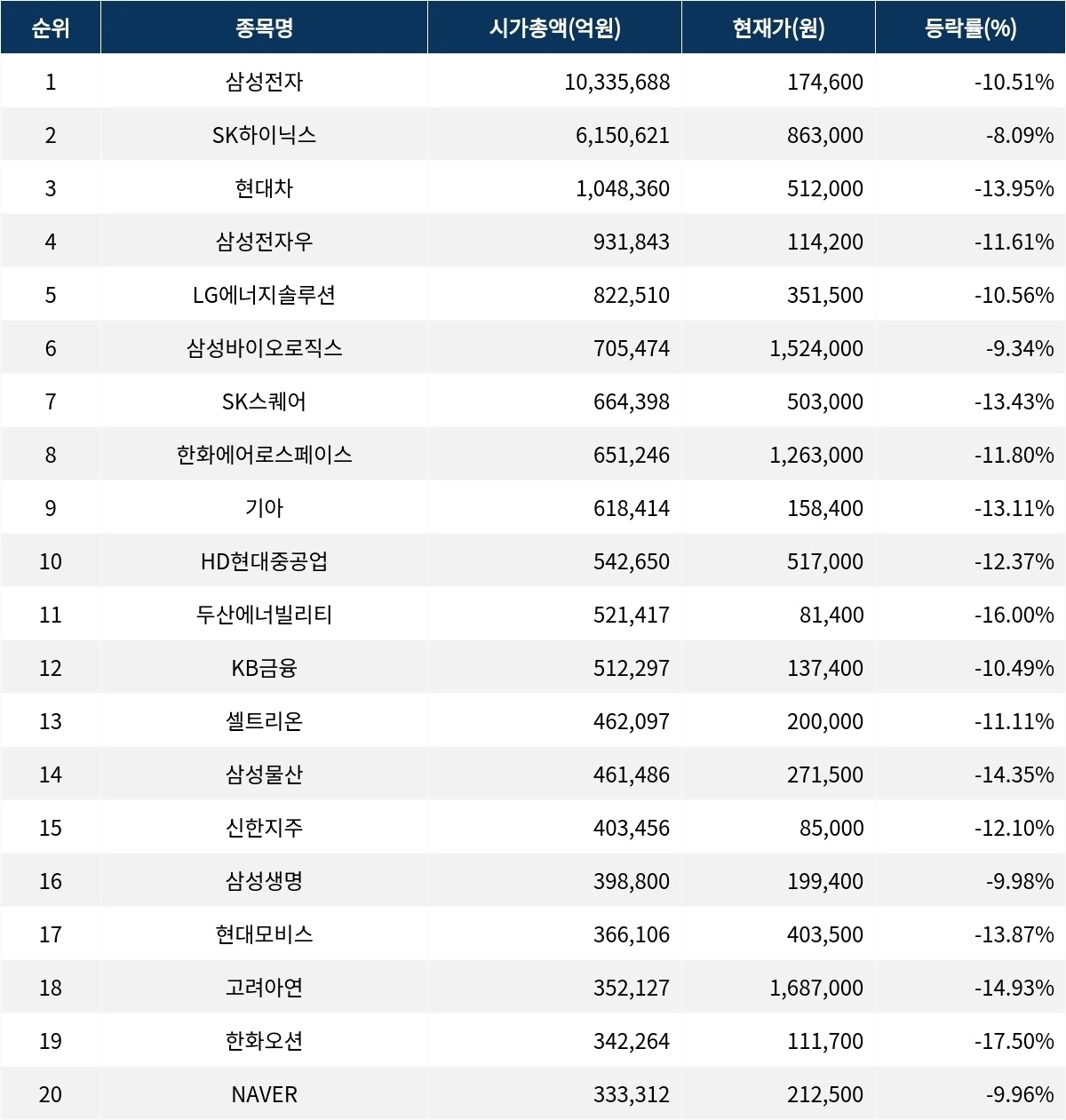 한편 시가총액 20위권 종목들은 두산에너빌리티(034020) ▼16.00%, KB금융(105560) ▼10.49%, 셀트리온(068270) ▼11.11%, 삼성물산(028260) ▼14.35%, 신한지주(055550) ▼12.10%, 삼성생명(032830) ▼9.98%, 현대모비스(012330) ▼13.87%, 고려아연(010130) ▼14.93%, 한화오션(042660) ▼17.50%, NAVER(035420) ▼9.96% 등의 성적을 기록하고 있다.