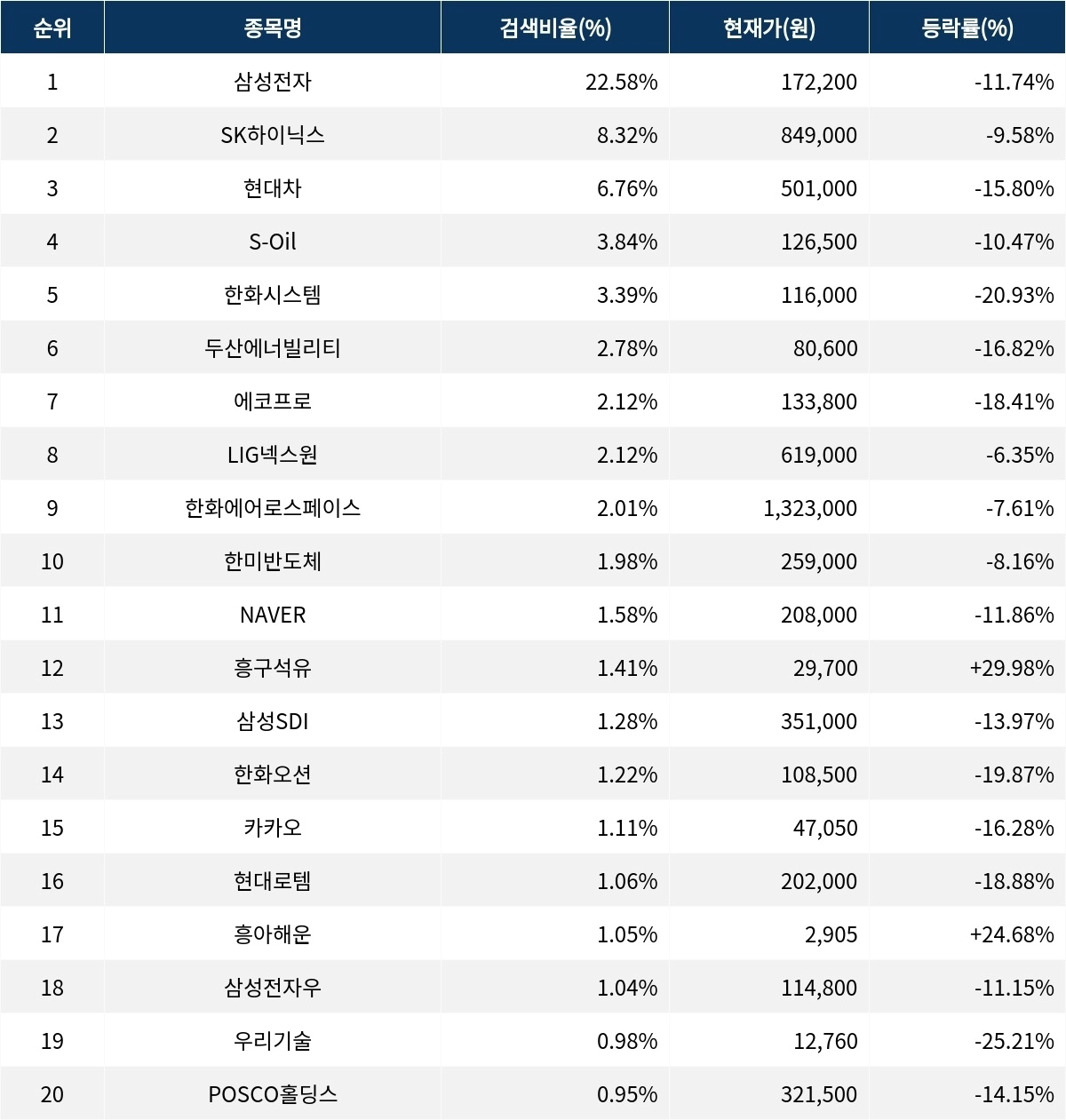 이어 검색비율 2위의 SK하이닉스(000660)는 하락률 9.58%로 마감했다. 검색비율 3위의 현대차(005380)는 15.80% 하락 마감했다. 검색비율 4위 S-Oil(010950)은 하락률 10.47%를 기록했다. 검색비율 5위 한화시스템(272210)은 20.93% 하락하며 급락했다.