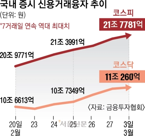 4일 금융투자협회에 따르면 지난 3일 기준 신용거래융자 잔액은 32조 8041억원으로 집계됐다. 7거래일 연속 역대 최대치를 경신한 규모다. 코스피 신용거래융자 잔액은 21조 7781억원으로 사상 최대를 기록했고 코스닥도 2021년 이후 처음으로 11조원을 넘어섰다. 신용거래융자는 투자자가 증권사에서 돈을 빌려 주식을 매수한 뒤 아직 갚지 않은 금액으로, 증시의 빚투 규모를 보여주는 대표적인 지표다.