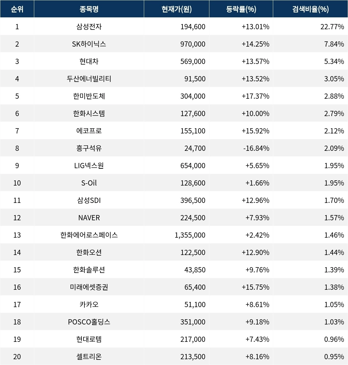 이 밖에도 삼성SDI(006400) ▲12.96%, NAVER(035420) ▲7.93%, 한화에어로스페이스(012450) ▲2.42%, 한화오션(042660) ▲12.90%, 한화솔루션(009830) ▲9.76%, 미래에셋증권(006800) ▲15.75%, 카카오(035720) ▲8.61%, POSCO홀딩스(005490) ▲9.18%, 현대로템(064350) ▲7.43%, 셀트리온(068270) ▲8.16% 등이 많이 검색되고 있다.