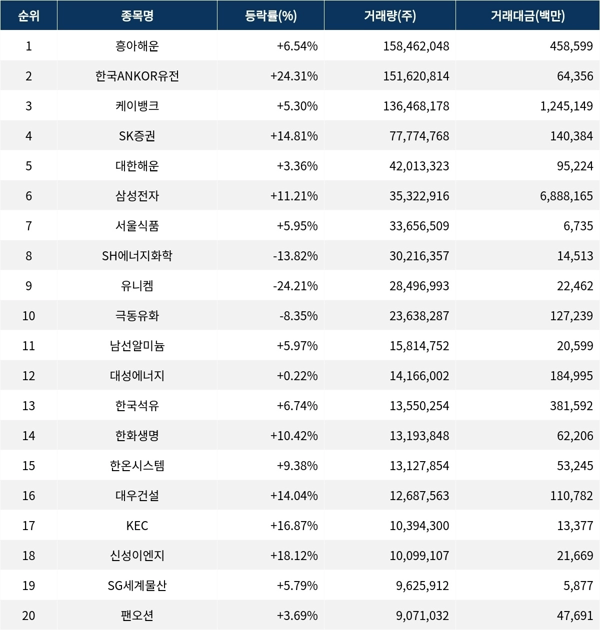 한편 거래량 상위 20위권 종목들은 남선알미늄(008350) ▲5.97%, 대성에너지(117580) ▲0.22%, 한국석유(004090) ▲6.74%, 한화생명(088350) ▲10.42%, 한온시스템(018880) ▲9.38%, 대우건설(047040) ▲14.04%, KEC(092220) ▲16.87%, 신성이엔지(011930) ▲18.12%, SG세계물산(004060) ▲5.79%, 팬오션(028670) ▲3.69% 등의 성적을 기록했다.