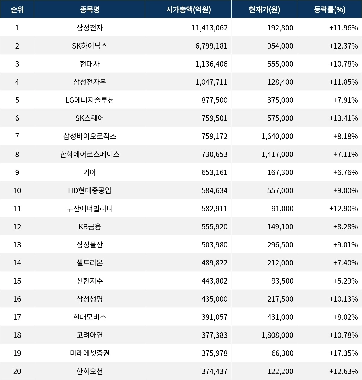 5일 오후 12시 30분 한국거래소에 따르면 시가총액 1위인 삼성전자(005930)는 현재가 19만 2800원으로 전 거래일 대비 11.96% 상승하며 1141조 3062억원의 시가총액을 기록하고 있다. 외국인 비율은 49.97%이며 거래량은 3455만 2743주에 달한다. SK하이닉스(000660)는 95만 4000원으로 12.37% 상승해 시가총액 679조 9181억원을 보유하고 있으며 외국인 비율은 53.79%, 거래량은 388만 5718주다.