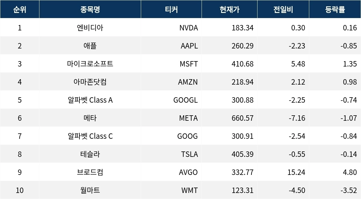 엔비디아(NVDA)는 183.34달러로 전일 대비 0.16% 상승하며 보합세를 기록했다. 마이크로소프트(MSFT)는 410.68달러로 1.35% 상승하며 강세를 보였다. 반면 애플(AAPL)은 260.29달러로 0.85% 하락하며 약세를 나타냈다.