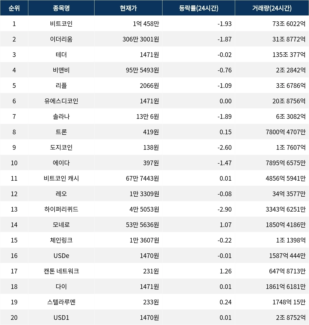 글로벌 가상자산 시황 중계 사이트 코인마켓캡(CoinMarketCap)에 따르면, 비트코인은 현재 1억 458만 원에 거래되고 있으며, 시가총액은 2091조 5736억 원이다. 24시간 동안 -1.93%의 등락률을 기록했으며, 1시간 등락률은 -0.21%로 최근 하락세가 지속되고 있다. 거래량은 73조 6022억 원이다. 이더리움은 306만 3001원에 거래 중이며, 시가총액은 369조 6800억 원이다. 24시간 등락률은 -1.87%이며, 1시간 등락률은 -0.05%로 하락세가 다소 완화되는 모양새다. 거래량은 31조 8772억 원으로 나타났다. 비앤비는 현재 95만 5493원에 거래되고 있으며, 시가총액은 130조 2897억 원이다. 24시간 동안 -0.76%의 등락률을 보였고, 1시간 등락률은 -0.05%로 하락세가 이어지고 있다. 거래량은 2조 2842억 원이다.